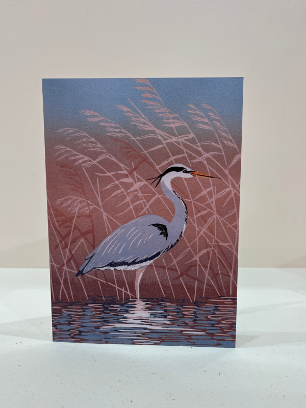 Set of four 5″ x 7″ greeting cards created from the original reduction linocuts, Cormorants at Cromer, Marsh Harrier at Carlton Marshes, Chasing Waves and Heron Waiting. Blank inside for your own message. Kraft paper envelopes.