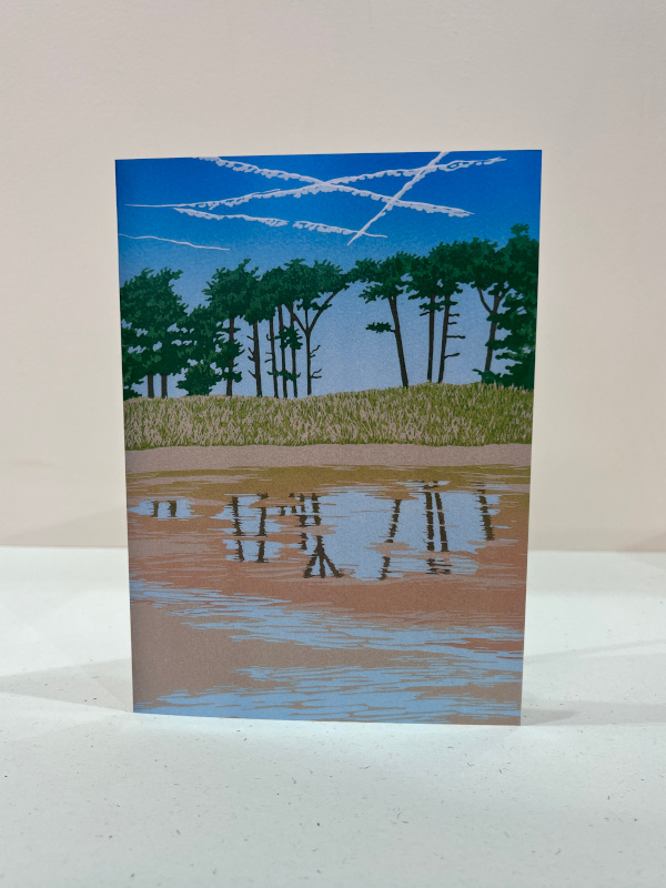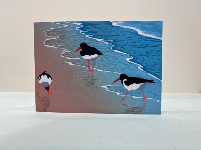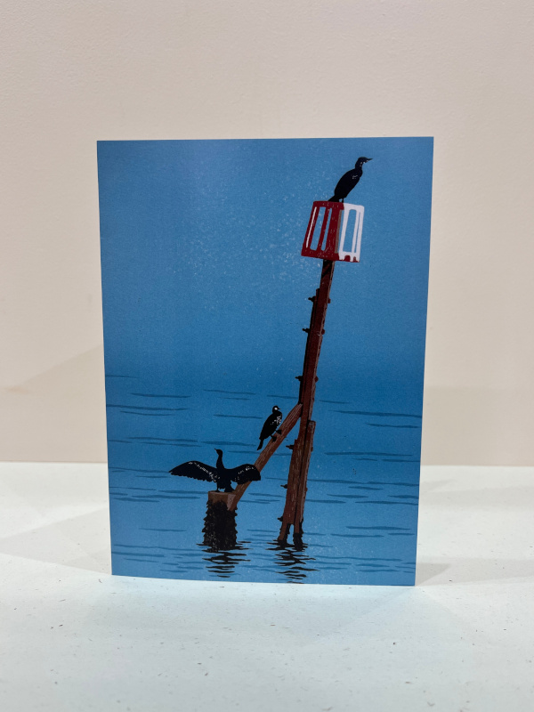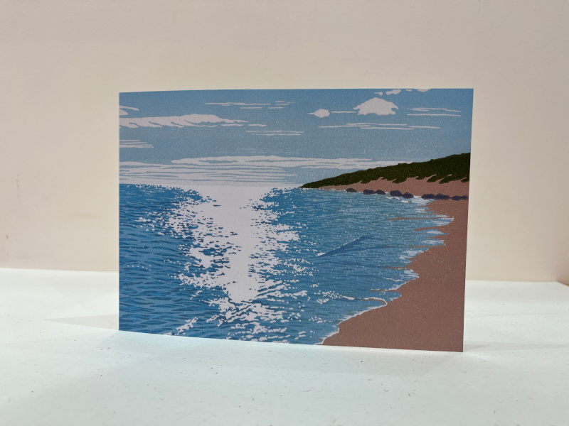 Set of four 5 x 7″ greeting cards created from the original reduction linocuts, Cormorants at Cromer, Perfect Morning, Chasing Waves and Homeward Bound. Blank inside for your own message. Kraft paper envelopes.