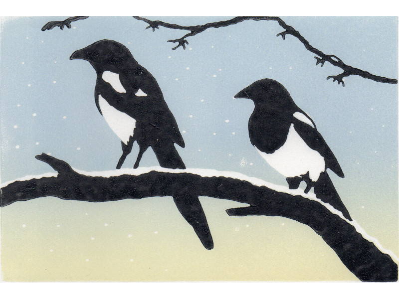 Test print of a two block linocut featuring two magpies, size 170 x 115mm. Hand printed using a small press on Hosho Japanese paper.